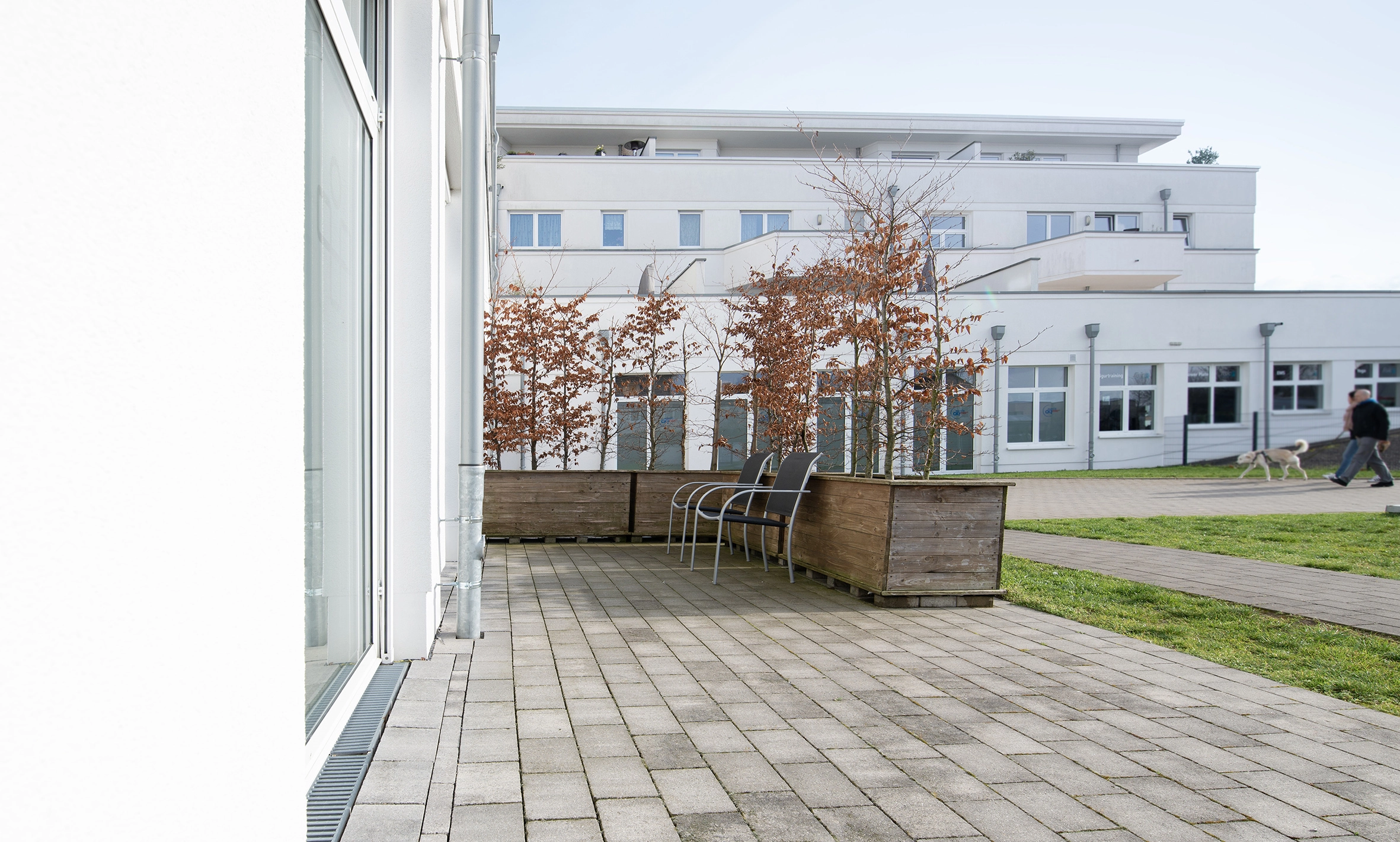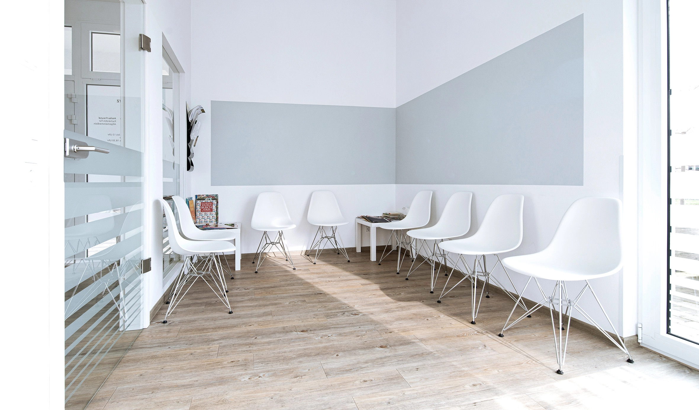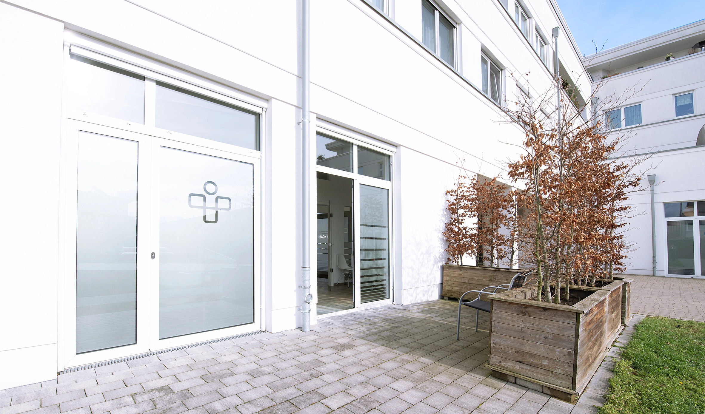 Darüber hinaus haben wir ein Freiluftwartezimmer: Gerade im Frühling und Sommer können unsere Patienten hier entspannt draußen sitzen. Zusätzlich reduziert es die Ansteckungsgefahr, da – neben der frischen Luft – in besonderen Fällen jedes Behandlungszimmer von außen betreten werden kann.